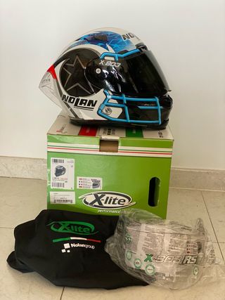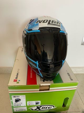 Casco de moto Nolan X-803 en carbono, talla L. NUEVO Usado un par de horas. - Diseño deportivo en azul y blanco. - Incluye bolsa de transporte. - Visera adicional oscura.