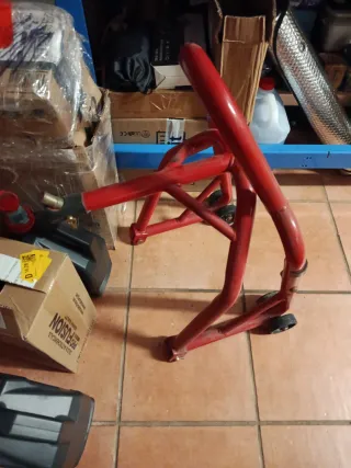 A estrenar . Par de caballetes para moto en color rojo. Ideales para elevar la moto y facilitar el mantenimiento. Precio por unidad. - Fabricados en metal resistente. - Incluyen ruedas para facilitar el movimiento. - Diseño robusto y estable. Los dos 90€ sueltos 50