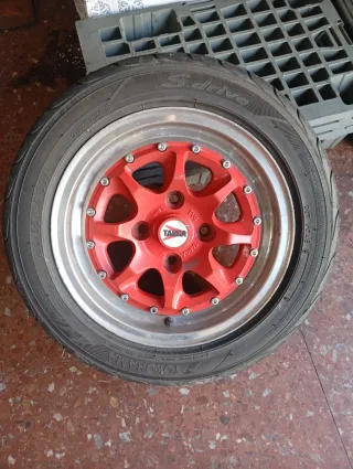 Juego de llantas Targa TV4 para psa y ford, con neumaticos 185-55-14 en buen estado pero algo viejas, un centro esta mal y se da otro en buen estado, es solo estetica ni vibra ni nada raro, tornillos inox recien puestos.