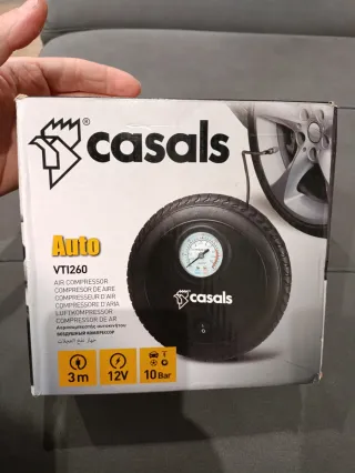 Compresor de aire portátil de la marca Casals, modelo VTI260. - Voltaje: 12V - Presión máxima: 10 Bar - Longitud del cable: 3 metros - Incluye manómetro para control de presión.