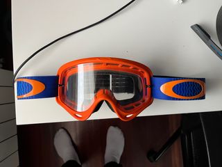 Gafas de motocross Oakley con un diseño llamativo en naranja y azul. - Marco de color naranja. - Correa azul con detalles naranjas. - Lente transparente.