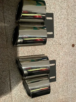 Set de embellecedores de escape con acabado cromado brillante. Añaden un toque deportivo y elegante al vehículo. - Material: Acero inoxidable. - Acabado: Cromado. - Diseño: Doble salida.