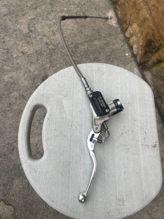 Bomba de embrague de la marca Formula, diseñada para usar con aceite minera, con latiguillo incluido, ideal para moto de Trial, prácticamente nueva. - Cuerpo principal de metal. - Palanca de embrague. - Depósito de líquido integrado.