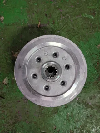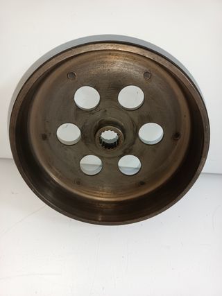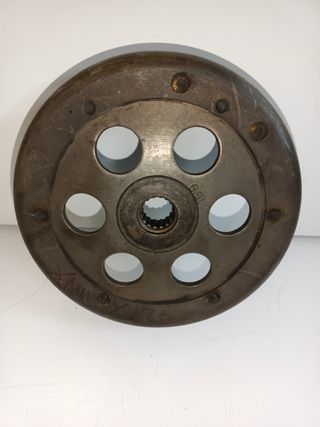 Embrague CRF 450 sin discos - Diámetro exterior aproximado: 13.5 cm. - Diámetro interior del eje: 2.5 cm. - Seis orificios para tornillos. - Material: Aluminio.
