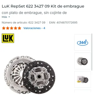 Kit de embrague LuK RepSet 622 3427 09. - Incluye plato de embrague. - Sin cojinete. - Número de artículo: 622 3427 09. - EAN: 4014870172695. Valido para un montón de vehículos. Algunos salen en la fotografía 3 Ubic 13M