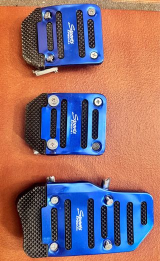 Juego de funda de pedales deportivos para coche, en color azul y negro. Ideales para darle un toque deportivo a tu vehículo. - Fabricados con materiales resistentes. - Diseño elegante y deportivo. - Fácil instalación. - Incluye 3 pedales: freno, acelerador y embrague.