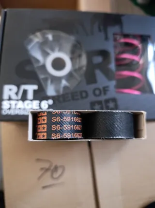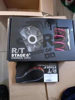 Kit de variador y correa de competición Stage6 R/T Para minarelli horizontal Yamaha aerox , jog rr, etc Todo nuevo a estrenar. - Variador Oversize Vario. - Correa Oversize Racing Belt. - Incluye muelle de embrague rosa.