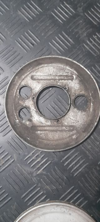 Tapa de embrague para Vespa. Pieza de metal con un acabado oscuro y desgastado. - Diámetro exterior aproximado: 15 cm. - Agujero central. - Tres agujeros adicionales alrededor del centro.