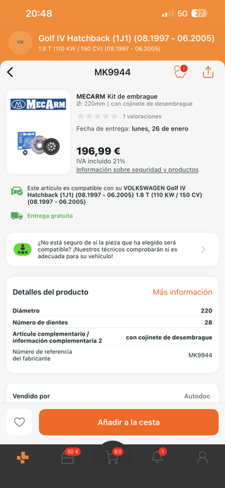 Kit de embrague de la marca Mecarm para Volkswagen Golf IV Hatchback (1J1) 1.8 T (110 KW / 150 CV) fabricado entre 08.1997 y 06.2005. - Diámetro: 220mm - Número de dientes: 28 - Incluye cojinete de desembrague - Referencia del fabricante: MK9944