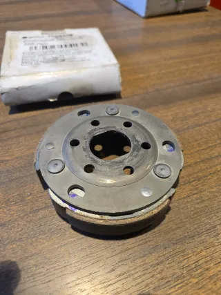 Copa de embrague para arranque de scooter Aprilia. Pieza metálica con estrías internas. Nuevo - Diseño circular con salientes exteriores.