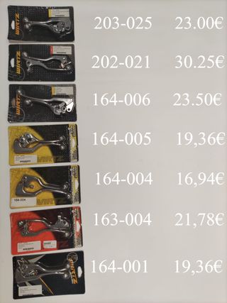 ***PRECIO por UNIDAD, indicado abajo, según la maneta*** AJP, BREMBO, TRIAL, KTM, BETA, HUSABERG, GAS GAS, HUSQVARNA. 1. ZE41-3683 : de 50.76€ a 43€ Maneta FRENO articulada, zeta, FP, ZE41-3683 (3 Dedos) CORTA 2. ZE42-3683 : de 50.76€ a 43€ Maneta EMBRAGUE articulada, zeta, FP, (3 Dedos) CORTA 3. ZE41-3281 : de 61.65€ a 47€ MANETA FRENO ARTICULA, ZETA,CP (3 Dedos) <M Type> 4. ZE42-3185 : de 63.65€ a 48€ MANETA EMBRAGUE ARTICULADA, ZETA, CP, 3DEDOS 5. ZE42-4684 : de 50.76€ a 43€ MANETA EMBRAGUE ZETA ARTICULADA (4 dedos) <M Type> 6. ZE42-4683 : de 50.76€ a 43€ MANETA EMBRAGUE ZETA FP ARTICULADA (4 dedos), (tipo M)