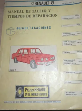 Manual de taller y tiempos de reparación para el Renault 8 TS y normal - Guía de tasaciones. - Secciones: Generalidades, Motor, Embrague, Caja de Cambios, Tren Delantero, Tren Trasero, Suspensión, Frenos, Electricidad, Encendido, Climatización, Carrocería, Útiles y Tiempos de Reparación. - Incluye información sobre piezas Renault en el mundo entero. - Garantía en reparaciones utilizando recambio original.