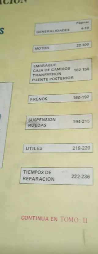 Manual de taller y tiempos de reparación para SEAT 131, Tomo I. Incluye guía de tasaciones. - Cubre motor, embrague, caja de cambios, transmisión y puente posterior. - También incluye frenos, suspensión y ruedas. - Publicado en enero de 1981.