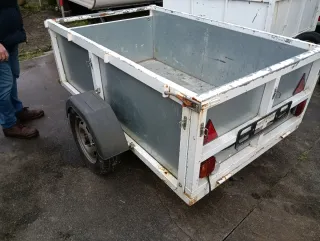 Remolque cerrado con lona azul, ideal para transportar carga. - Estructura blanca. - Rueda de repuesto. - Enganche. - Luces traseras. Cambio por plataforma porta maquinaria de 3 m x 140 de cama utiil de 750 kilos eje de 1000 aproximadamente y freno de inercia