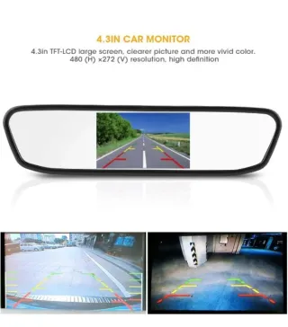Kit de cámara de marcha atrás para coche con pantalla. - Cámara de visión trasera con luz de freno integrada. - Pantalla de espejo retrovisor. - Incluye manual de instrucciones.