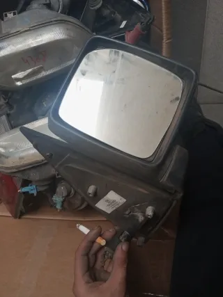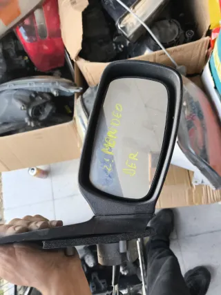 Espejo retrovisor exterior derecho para Nissan Trade. Se sujeta mediante un brazo doble con fuelles protectores. - Carcasa de plástico negro. - Superficie reflectante cuadrada.