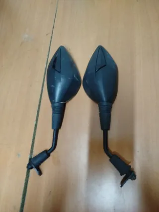 Par de espejos retrovisores negros para motocicleta. Diseño angular y moderno. Negociable. Como nuevos - Carcasa de plástico resistente. - Brazo flexible con fuelle. - Rosca de montaje estándar.