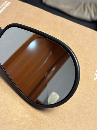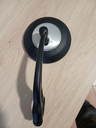 Espejo retrovisor para manillar de motocicleta Triumph. Diseñado para adaptarse a manillares. - Forma ovalada. - Marco negro. - Tiene una esquina rota pero no se despega