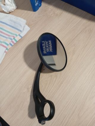Espejo retrovisor negro con logo. - Diseño triangular. - Soporte ajustable con tornillos. - Material: Metal y plástico. - no tiene el cristal de ahí su precio - tornillo 8mm