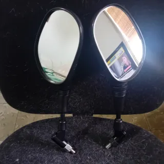 Par de espejos retrovisores universales con un diseño clásico estilo California. Son de color negro y tienen una forma ovalada. - Diseño ovalado. - Acabado en negro. - Incluye tornillería para su montaje. No se han llegado a instalar.
