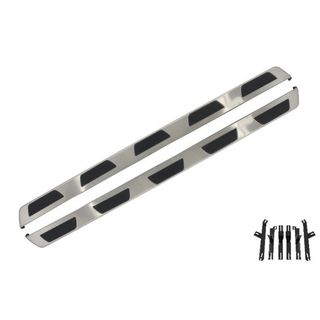 Set de 2 estribos / estriberas / pasos laterales de alta calidad fabricado en acero inoxidable, aluminio y PVC. Contiene todos los accesorios necesarios para su instalación, grapas, remaches, etc. Compatible con Audi Q7 de 2016 en adelante.