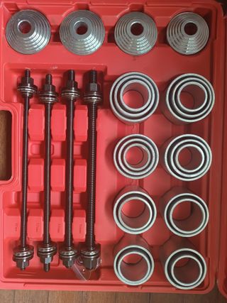 Kit extractor de silentblocks y rodamientos para diversas aplicaciones. - Incluye 3 barras roscadas. - Incluye múltiples copas de extracción y montaje de diferentes tamaños. - Estuche organizador de plástico rojo.