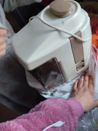 Extractor de pulpa en color blanco y beige. - Diseño compacto. - Tapa superior. - Ventana transparente.