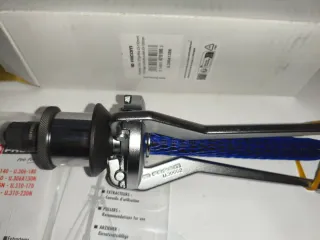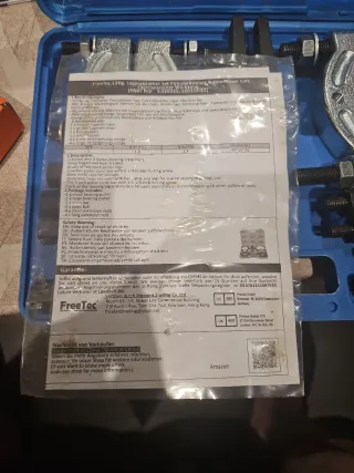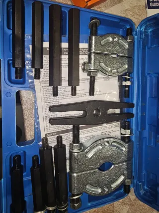 Kit extractor de rodamientos en su maletín azul. - Incluye varias piezas metálicas y de plástico. - Maletín de transporte azul con compartimentos.