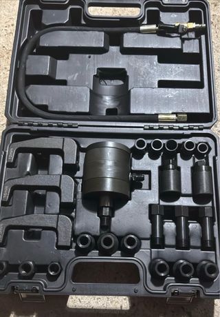 Kit de extractor de inyector neumático de 21 piezas. - Incluye un cilindro neumático. - Viene con varios adaptadores y accesorios. - Presentado en un maletín de plástico negro.
