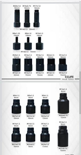 Juego de extractores de tornillos y tuercas dañados de la marca CCLIFE. - Incluye 13 piezas. - Tamaños de 8 mm a 19 mm. - Fabricado en Alemania.
