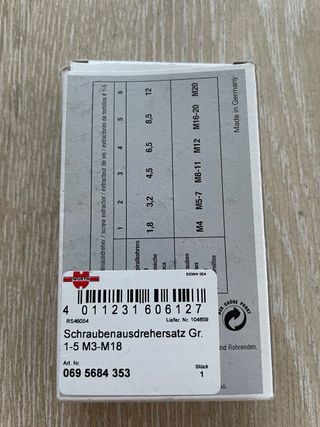 Conjunto de 5 extractores de tornillos, macho conico a izquierdas, de la marca alemana Wurth. Sirven para extraer tornillos o esparragos rotos. Estan fabricados en resistente cromo-vanadio, forjado. Medidas: sirven para metricas desde 3 a 18. Modo empleo: Taladrar en el centro de la pieza a extraer con la broca indicada en la tabla. Enroscar el macho correspondiente a izquierdas. Seguiremos introduciendo el macho a izquierdas hasta conseguir extraer la pieza sin dañar la rosca hembra. El producto esta nuevo, nunca ha sido usado. Se entrega con el embalaje original. Precio de venta en Wurth: 66€ + IVA