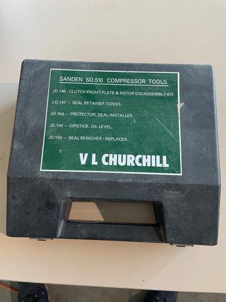 Kit de herramientas para compresor Sanden SD.510. - JD.146: Kit de embrague, placa frontal y rotor. - JD.147: Pinzas para retenedor de sellos. - JD.164: Protector e instalador de sellos. - JD.149: Varilla para nivel de aceite. - JD.150: Extractor/reemplazador de sellos. - Marca: V.L. Churchill. JAGUAR LAND -ROVER Y OTROS