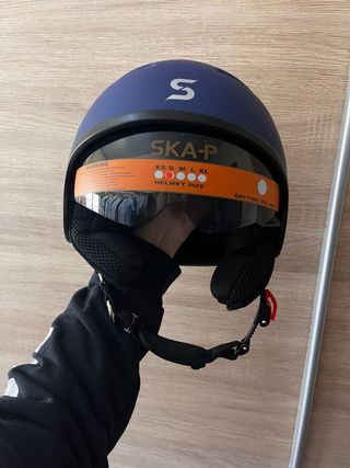 Casco de moto SKA-P, color azul marino, con visor. - Talla: S - Con funda, y en su caja. - Visor solar integrado que se sube y baja. - Visera antiarañazos - Extractores de aire traseros para un buen flujo de aire - Entradas de aire en la zona superior - Cubiertas para tapar los extractores superiores - Interior desmontable y lavable - Cierre micrometrico. - Incluye etiqueta de advertencia y de uso diurno. Precio Negociable