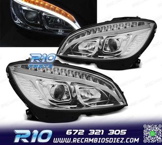 Móvel: 672 321 305 - Referencia: RLC011489. FAROS LED TUBE LIGHT DINAMICO PARA MERCEDES W204 07-10 CROMADO Juego de Faros delanteros "TUBE LIGHT" con Intermitente LEDs Dinamico con Movimiento Secuencia compatibles para MERCEDES "W204" - Año de Fabricacion: 2007 al 2010 - Diseño Cromado - Faros con Luz de Posicionamiento Fibra Optica + Intermitente LEDs Dinamico - No validos para modelos con Xenon de Origen - Con With Dynamic Turn Signal. (Intermitentes LEDs con Movimiento Dinamico) - Compatibles con ordenador de a Bordo - Facil y sencillo montaje (Plug and Play / Conectar y Listo