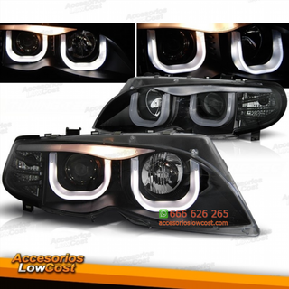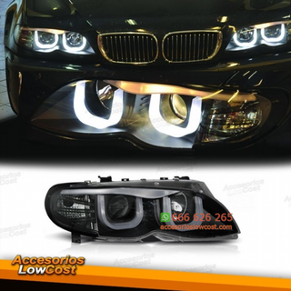 REF: AL007999 FAROS LUZ DIURNA LED PARA BMW SERIE 3 E46 (01-05) LIMOUSINE/TOURING, H7+H1, FONDO NEGRO. Juego de faros delanteros: - Válidos para: BMW E46 de 2001 al 2005, Limousine y Touring. - Color: transparente, fondo negro. - Compatibles con ordenador de a bordo - Fácil y sencillo montaje (Plug and Play / Conectar y Listo) - Sustituyen los Faros de Origen, no requieren ninguna modificación. - Precio por Juego de Faros (Izquierdo + Derecho) ILUMINACION; - Luz diurna: LED Angel Eyes diseño en U - Indicador intermitencia: bombilla convencional. - Luz de Cruce y Largas: H7 (no incluido) +H1. - Regulación Eléctrica.
