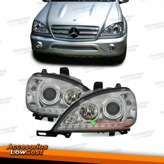 REF: AL007842 SET FAROS DE DISEÑO PARA MERCEDES W163, 02-05. Juego de faros completo, lado derecho e izquierdo. Cristal claro, fondo cromado. Con moldura. Luces de posición LED; óptica luces diurna. Tipo de bombillas: h7/ h7. Con servomotor de regulación de alcance de luces. FAROS MERCEDES LUZ DIURNA LED W163, 02-05 CRISTAL CLARO/CROMADO