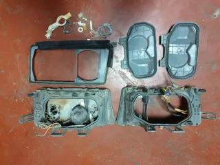 Restos de pareja de faros Hella para Mercedes W201 190. Tapas, carcasas y cableado en buen estado, sin roturas. Parabolas y sus palancas en mal estado. Se pueden usar para reparar o completar otros faros.