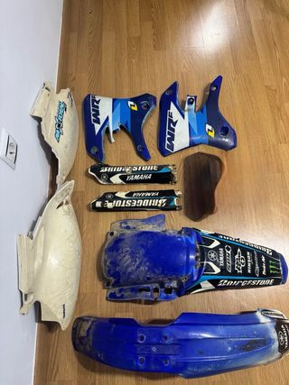 Juego completo de pastas para Yamaha WR250F del año 2003. Incluye guardabarros delantero y trasero, tapas laterales y frontal. - Guardabarros delantero azul. - Guardabarros trasero azul con adhesivos. - Frontal azul con faro. - Tapas laterales WR azules y blancas.