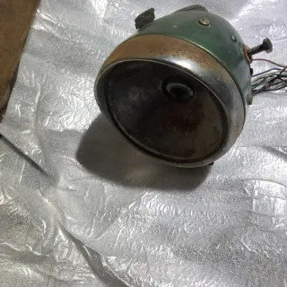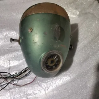 Faro delantero para moto Ducati 175, con velocímetro integrado. - Carcasa metálica verde. - Detalle de velocímetro con escala hasta 80. - Incluye cableado. -Le falta el cristal del faro.