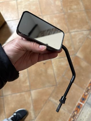 Espejo para moto o scooter con acabado en carbono. - Diseño deportivo y moderno. - Carcasa con patrón de fibra de carbono. - Brazo de sujeción negro.