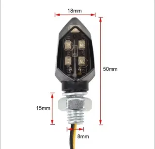 Juego de intermitentes LED para moto. Diseño moderno y compacto. Homologado para ITV, ideal motos de enduro y trail. - Carcasa de plástico negro ahumado. - Luz LED ámbar. - Medidas: 50mm (alto) x 18mm (ancho). - Rosca de montaje: 8mm. - Longitud de la rosca con tuerca: 15mm. PRECIO POR LOS 4 INTERMITENTES