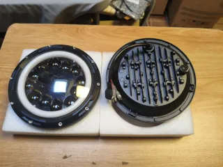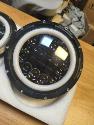 Se venden dos faros circulares para coche o moto con aro de luz LED blanco. - Diseño moderno con múltiples reflectores. - Aro de luz LED blanco. - Carcasa negra. - Parte trasera con disipador de calor.