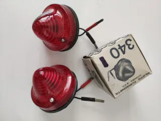 Se vende pareja de pilotos traseros Gemo de color rojo de. Son nuevos nunca usados con normales signos del paso del tiempo. La pintura blanca del contorno presenta algunas saltaduras debido a su almacenaje. Tulipas roscadas, base de metal. Pilotos clásicos o vintage.