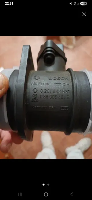 Caudalímetro de la marca Bosch, referencia 0281002531, compatible con motores TDI. - Pieza de recambio para vehículos. - Conector negro. - Cuerpo principal negro con detalles grises.