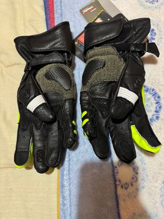Guantes de cuero para moto con detalles en amarillo. - Material principal: cuero. - Diseño con protecciones. - Cierre ajustable. - Sin estrenar - tienen los plásticos de protección sin quitar