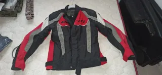 Chaqueta de cordura con diseño deportivo en negro, rojo y gris. Tiene el forro interior desmontable y sus protecciones Talla L - Mangas largas. - Cierre de cremallera frontal. - Cuello alto.