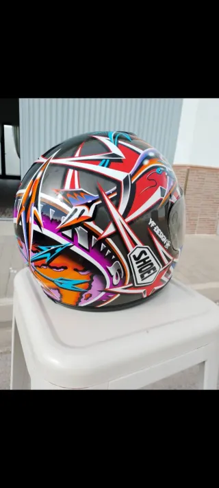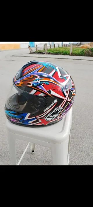 Casco de moto Shoei Norick Abe con un diseño llamativo y colorido. - Diseño gráfico vibrante. - Marca: Shoei. - Modelo: Norick Abe. Talla S Exteriormente en muy buen estado tiene naricera original por dentro si está muy deteriorado de los años.