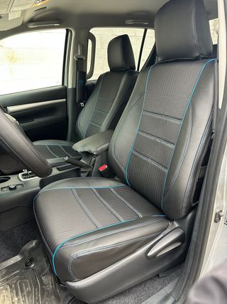 Fundas de asiento diseñadas específicamente para Toyota Hilux. - Diseño a medida para Toyota Hilux. - Materiales: polipiel y tela, todo en polipiel o todo de tela. - Fundas complemtamente personalizadas Para más información 615 914 387 - Detalle de costuras en color azul.