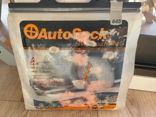 Fundas de tracción para nieve y hielo para invierno AutoSock, modelo 645. - Diseñadas en Noruega. - Alta performance. - Incluye instrucciones en varios idiomas. - cuidan el neumático - los tamaños de los neumáticos pueden verse en la foto. Precio nuevas: 90€. vendo por cambio de coche y ya no me sirven. Fundas nuevas a estrenar. Sin abrir.