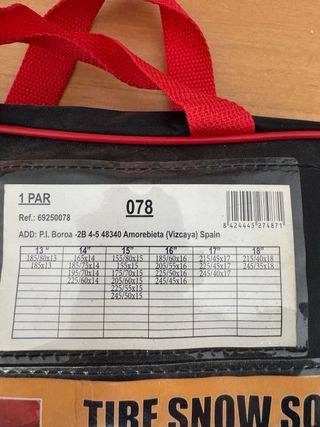 Descripción (pegar tal cual): Vendo fundas/calcetines de nieve textiles GRIP Nº520, 2 unidades, con bolsa original. ✅ Instalación rápida (en la bolsa indica aprox. 3 min). ✅ Apto para vehículos con ABS/ESP. ✅ Velocidad máxima recomendada: 50 km/h. 📌 Compatibilidad por medida de neumático: en la etiqueta aparecen las medidas compatibles (ver fotos)..